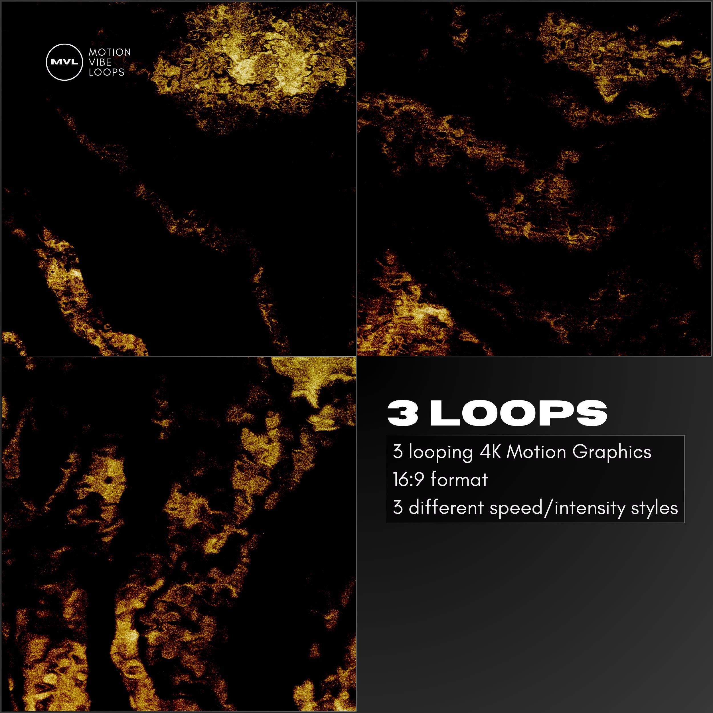 In this package you get three high quality 4k motion graphics loops, allowing for continuous play without any jarring interruptions. Crafted with versatility in mind, they all have the same style, but different speeds and intensitys. These seamless 4K loops are perfect for led walls, projections and projection mappings, as well as all sorts of digital backgrounds.